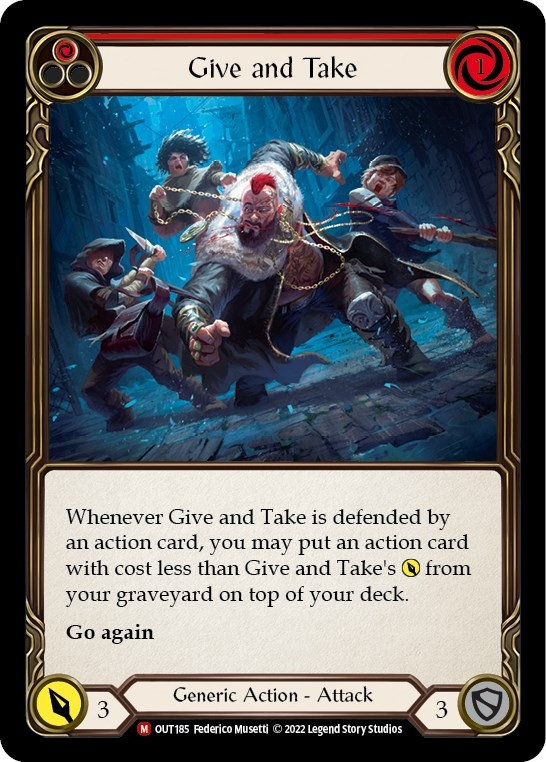 | Description: | Whenever Give and Take is defended by an action card, you may put an action card with cost less than Give and Take's [Power] from your graveyard on top of your deck. Go again |